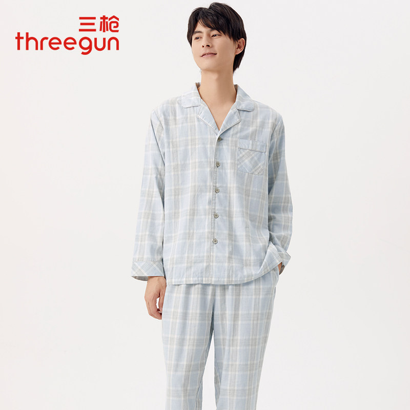 三枪家居服套装男士高支纯棉彩格翻领开襟长袖长裤起居服全棉睡衣