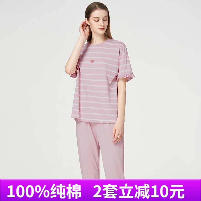 三枪睡衣女纯棉简约条纹2021春夏新品全棉水柔棉女士家居服套装