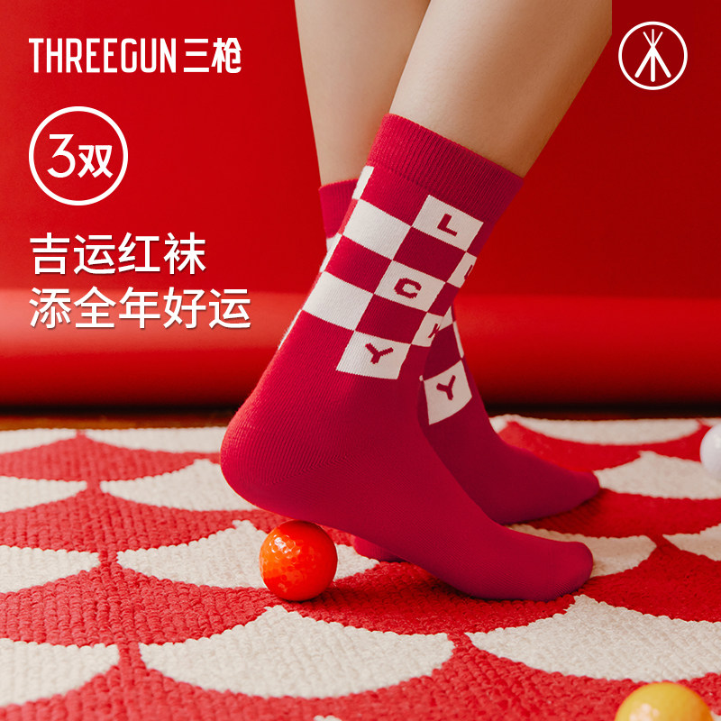 [3双]三枪袜子女中筒袜3A抗菌红袜秋季防滑外穿潮无骨棉袜本命年