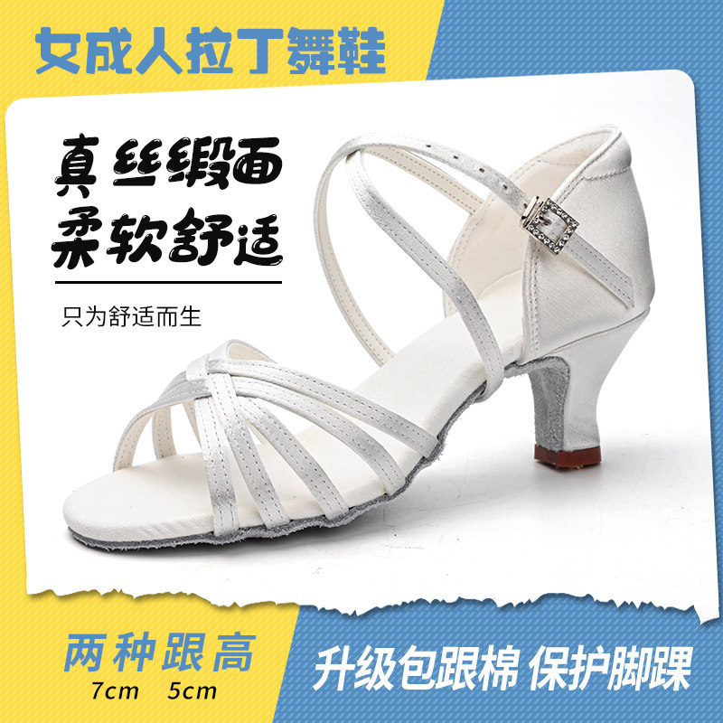 三莎专业拉丁舞鞋女成人真丝缎面软底中高跟国标交谊广场夏舞蹈鞋