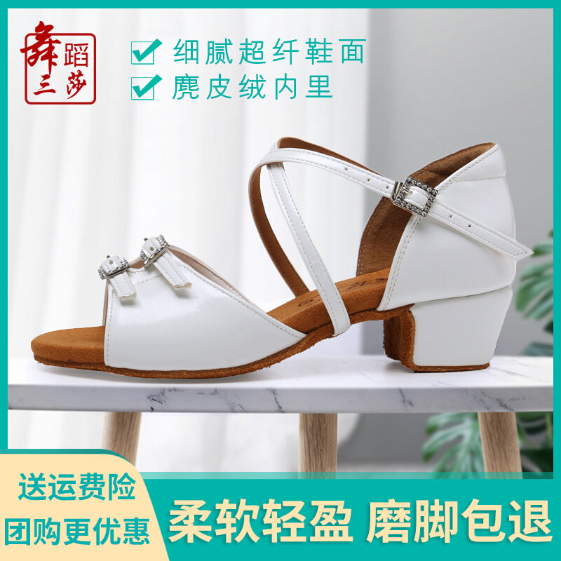 正品三莎专业少儿童拉丁舞鞋女童软底练功中低跟初学者白色舞蹈鞋