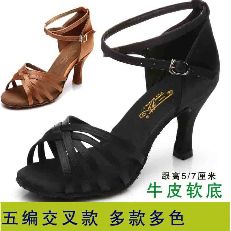 三莎成人拉丁舞鞋专业五带成年女士中高跟缎面舞蹈鞋软底跳舞夏季