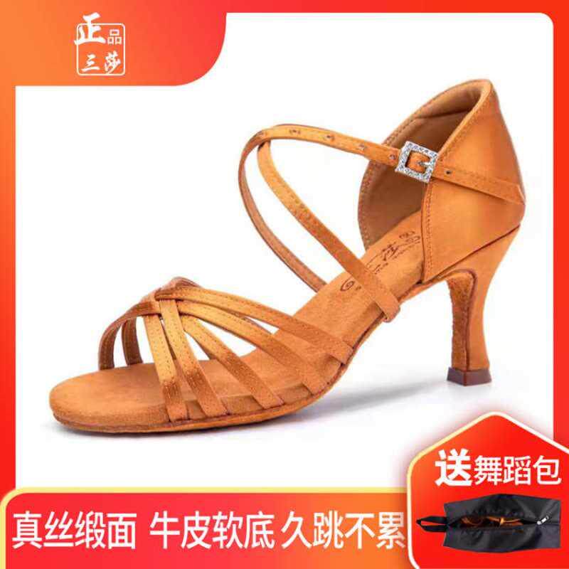正品三莎专业拉丁舞鞋女2021年新款成年女士中高跟跳舞软底舞蹈鞋