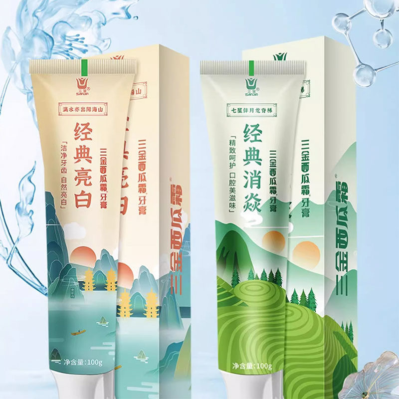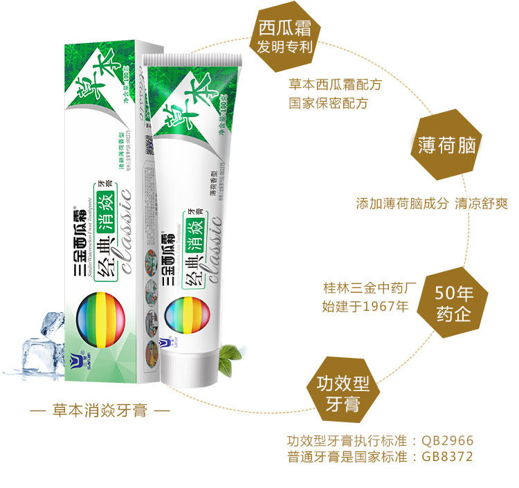 三金西瓜霜牙膏口腔清新男女草本经典消焱100g+经典亮白100g山水
