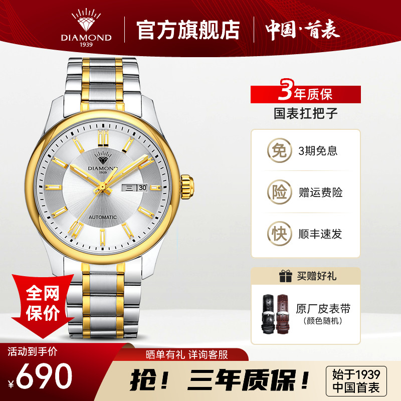 上海钻石牌手表男自动机械表简约962防水S100正品老国产男士手表