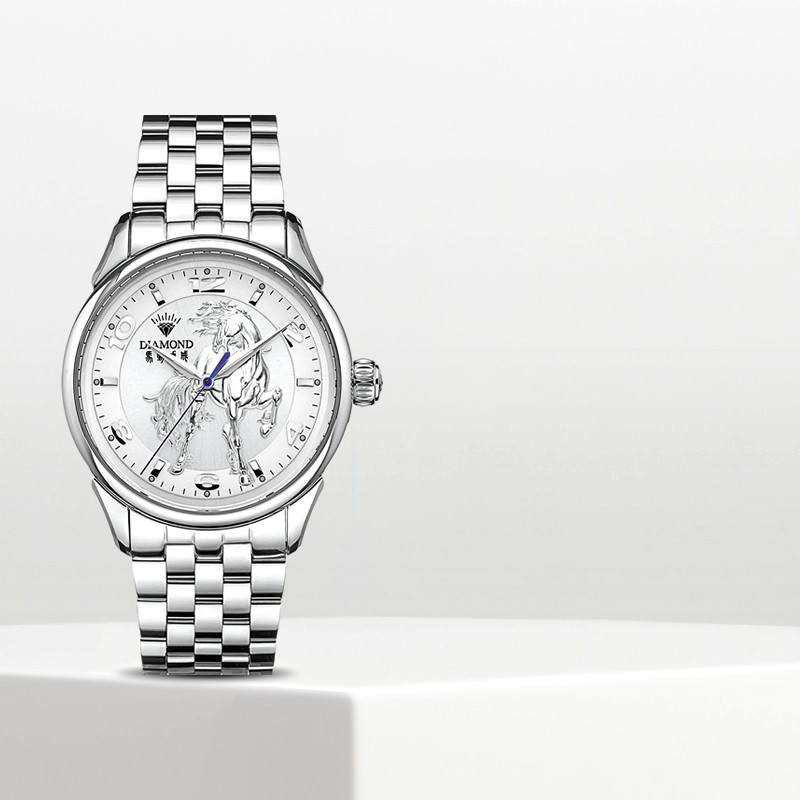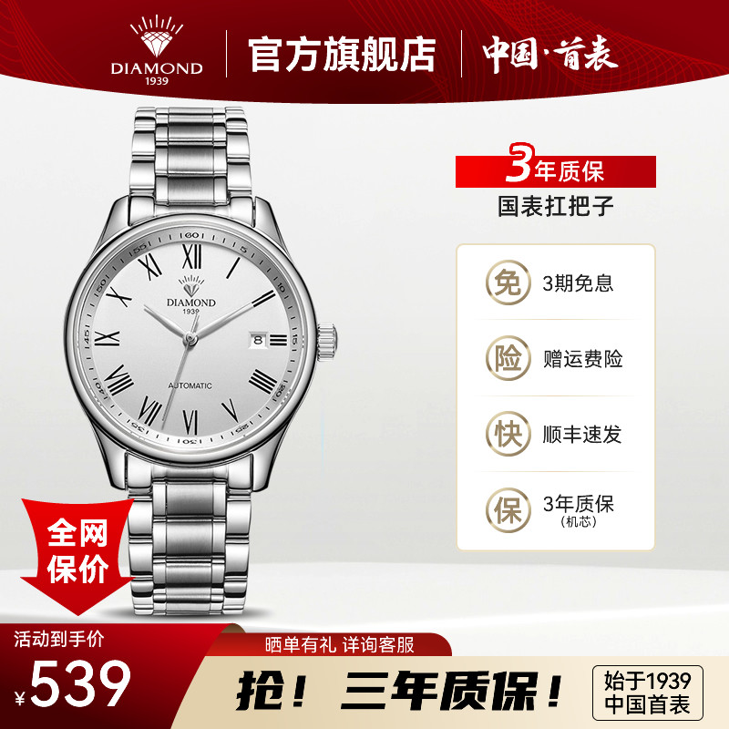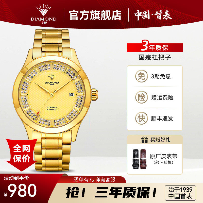 上海钻石牌手表时尚镶钻老国产S301官方正品钢带防水自动机械腕表