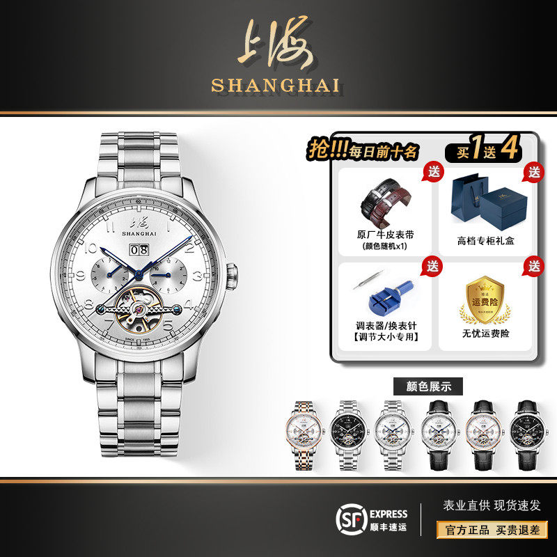 Shanghai/上海牌手表镂空飞轮自动机械表男夜光防水国产正品6005