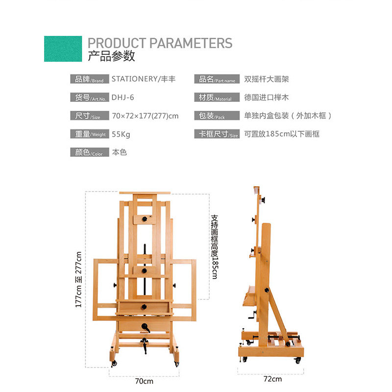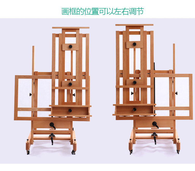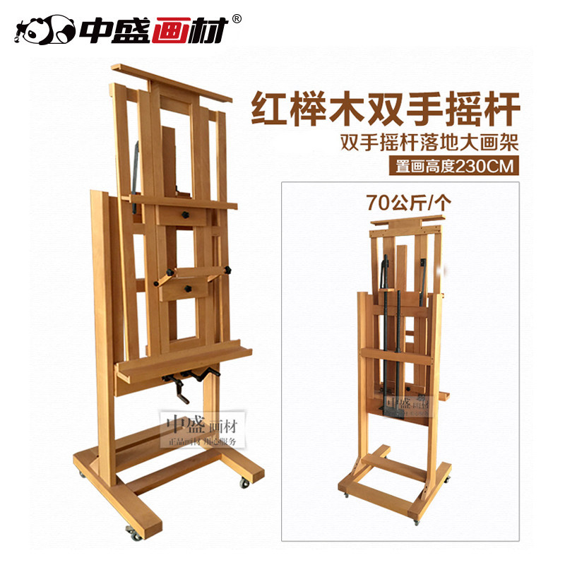红榉木 木质制带轮双摇杆手摇大型油画画架 可前倾很稳