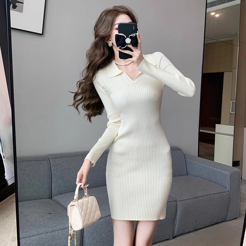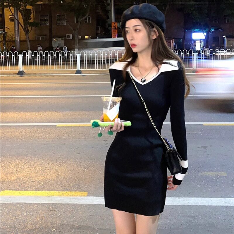 LILY MOST简约风复古POLO领针织连衣裙女秋冬新款港风显瘦包臀裙