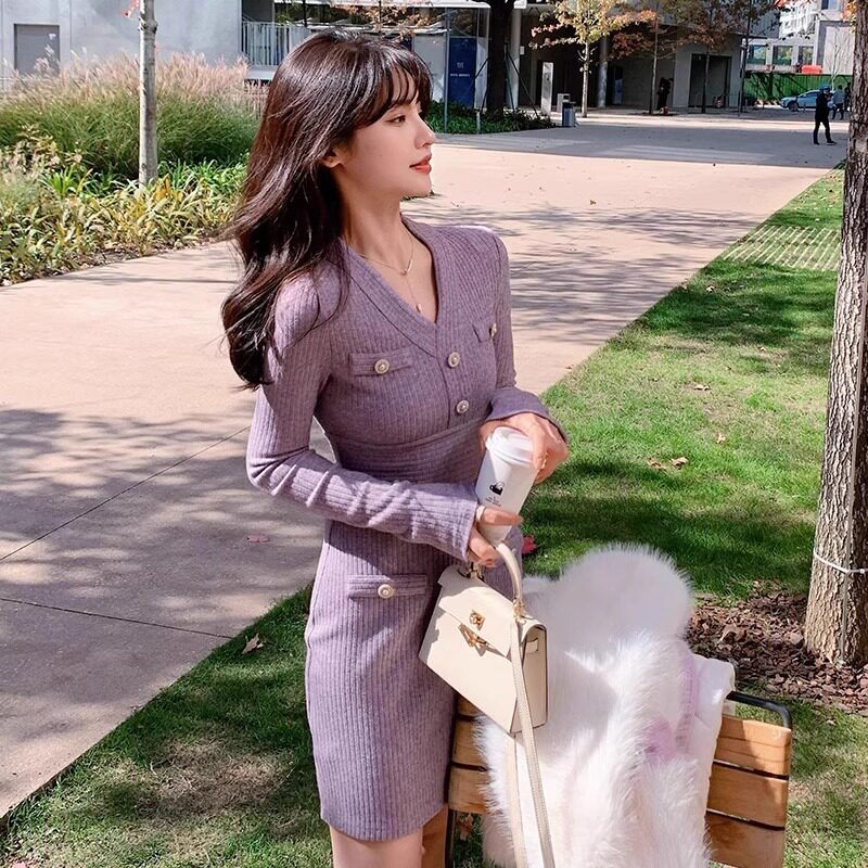 LILY MOST灰色v领长袖毛衣裙女秋冬季内搭打底针织包臀紧身连衣裙