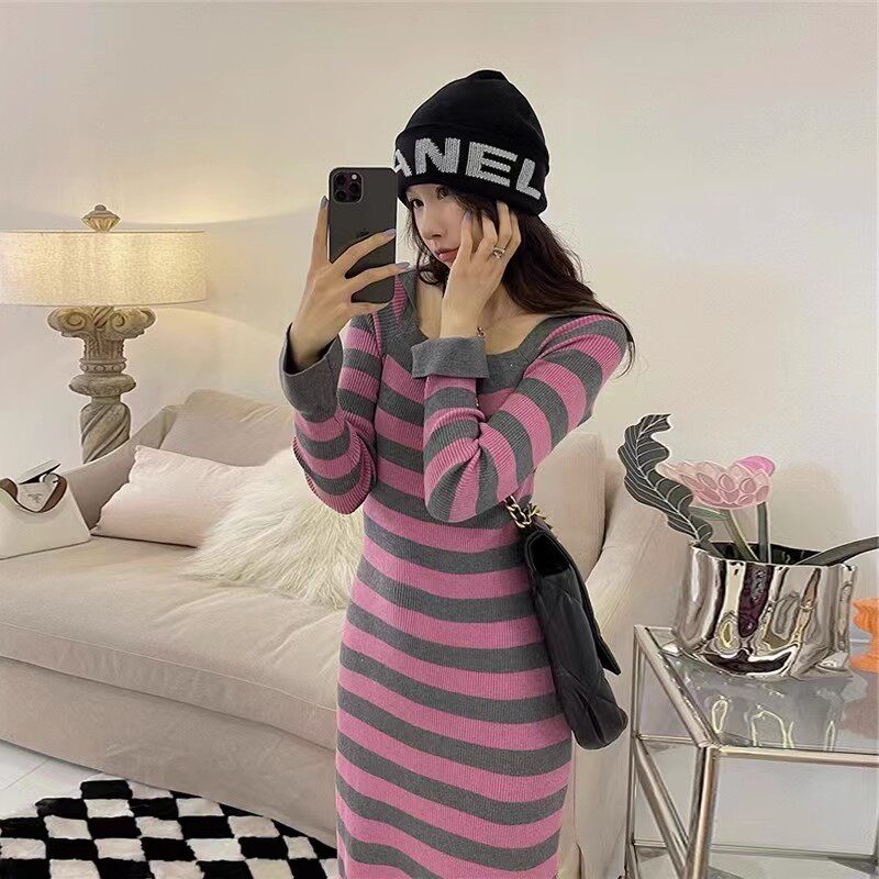 LILY MOST配大衣修身包臀长裙2023秋季新款温柔风条纹针织连衣裙