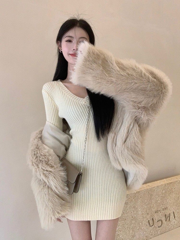 LILY MOST长袖V领针织连衣裙女秋冬辣妹纯欲风紧身性感包臀毛衣裙