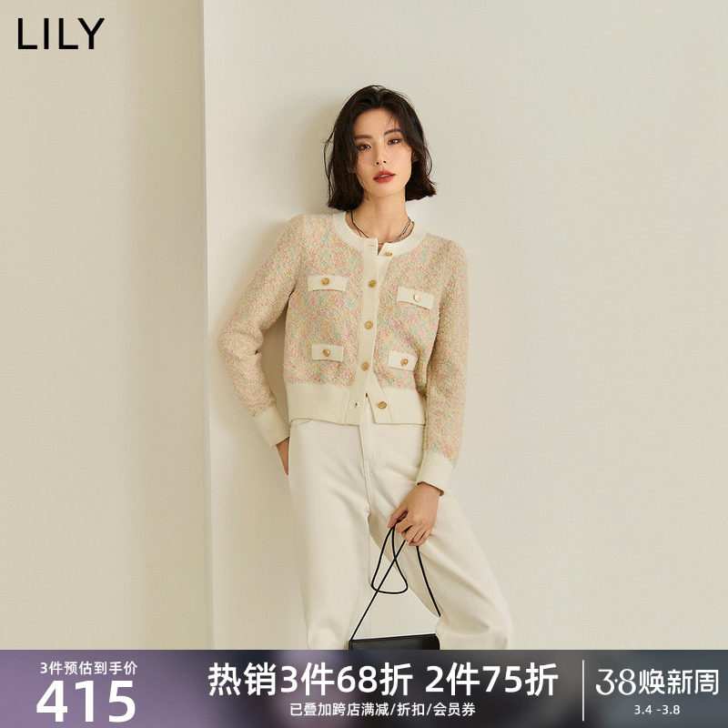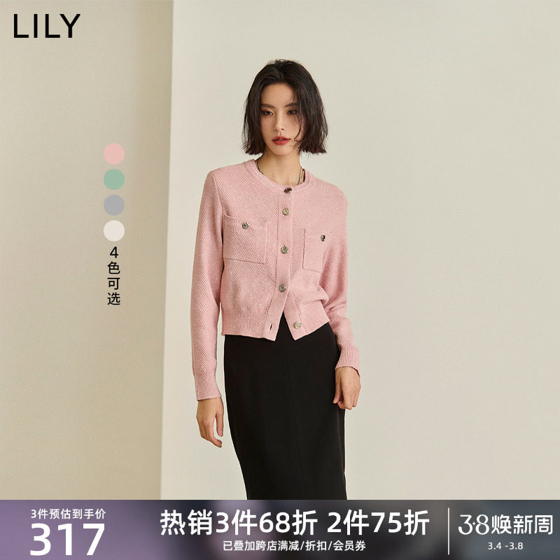 LILY2024春新款女装气质商务通勤复古小香风粉色修身短款针织开衫
