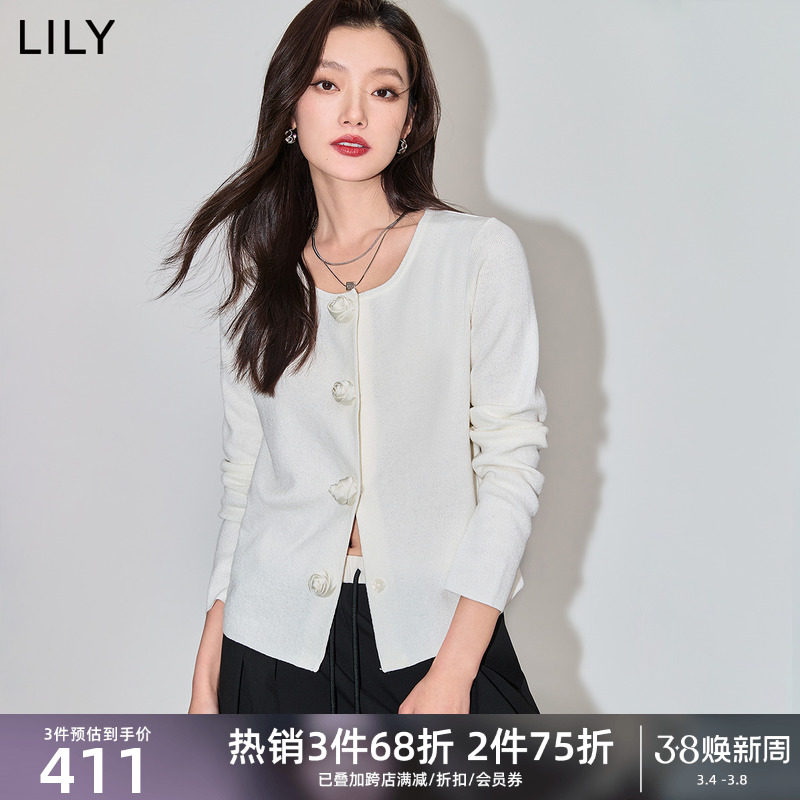 LILY2024春新款女装含绵羊毛都市通勤浪漫温柔短款修身款针织开衫