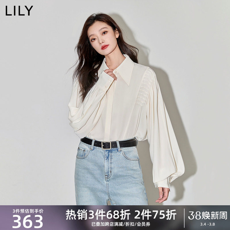 LILY2024春新款女装时尚通勤气质别致复古灯笼袖宽松垂坠感白衬衫