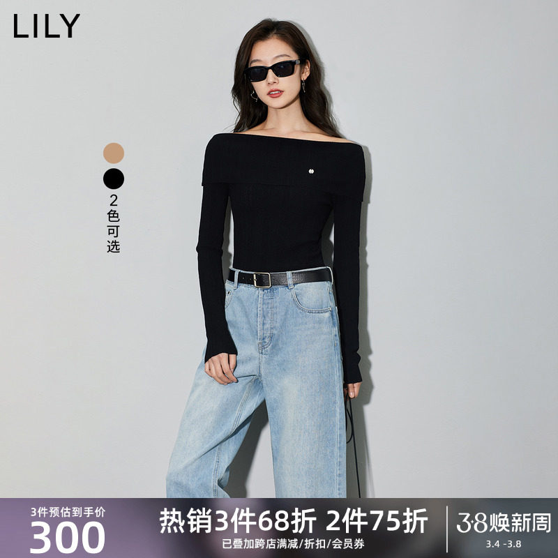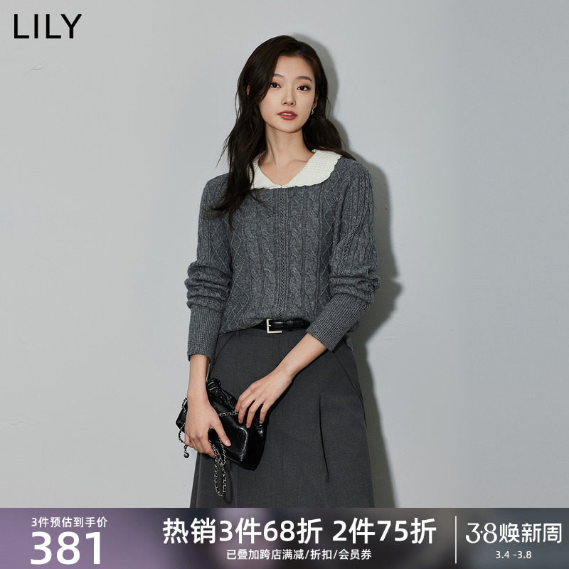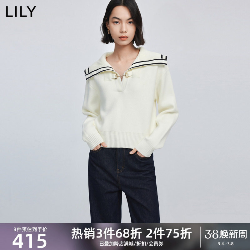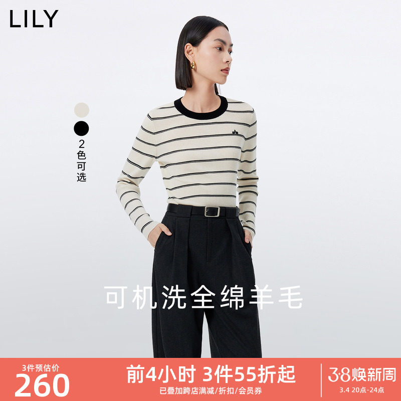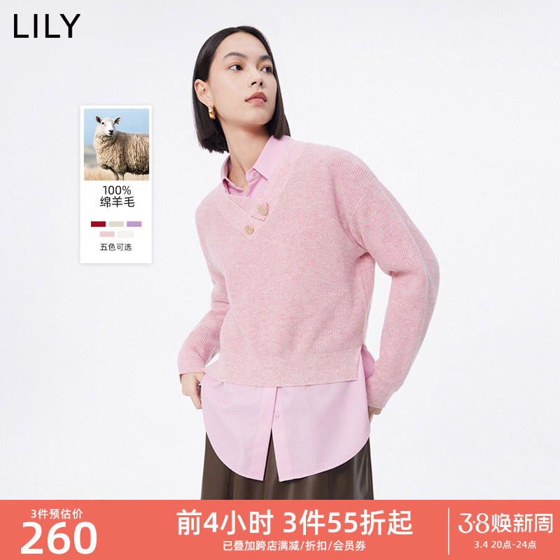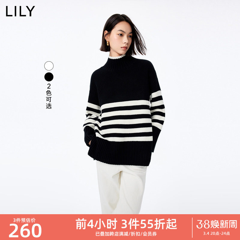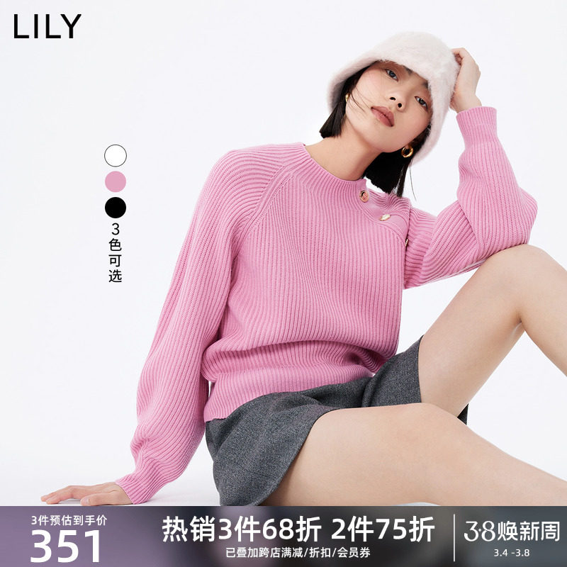 LILY新款女装轻软贴肌全绵羊毛气质纯色通勤款宽松毛针织衫