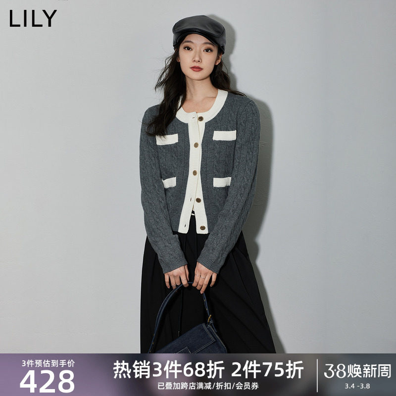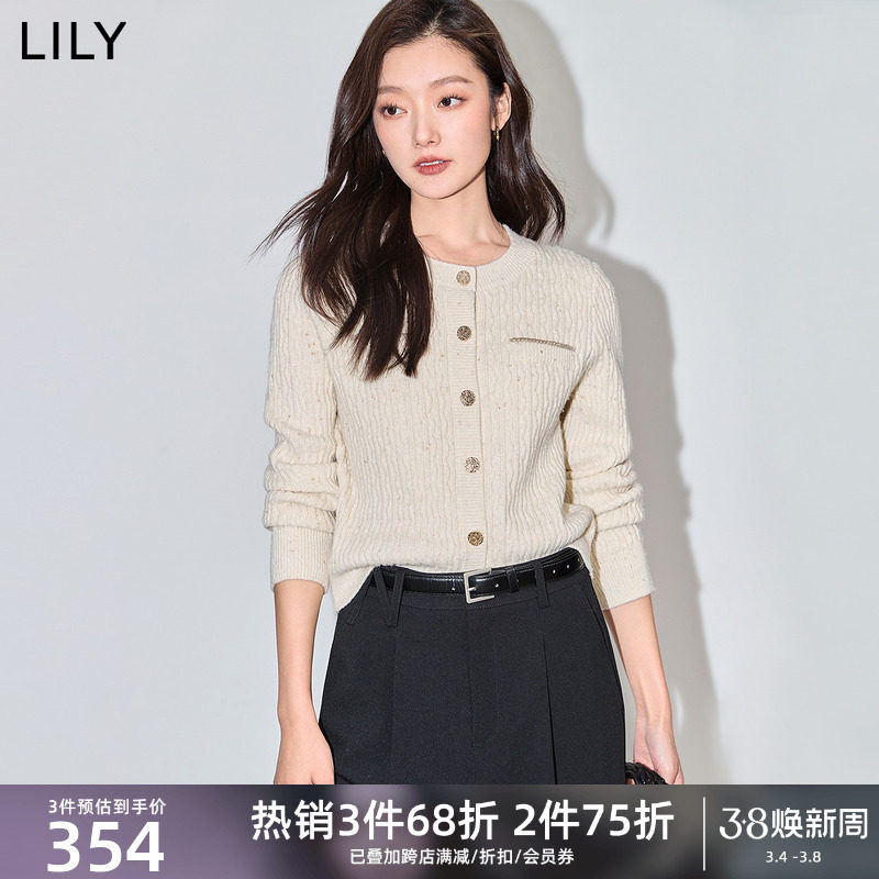 LILY新款女装多色系含绵羊毛气质通勤修身圆领长袖针织开衫