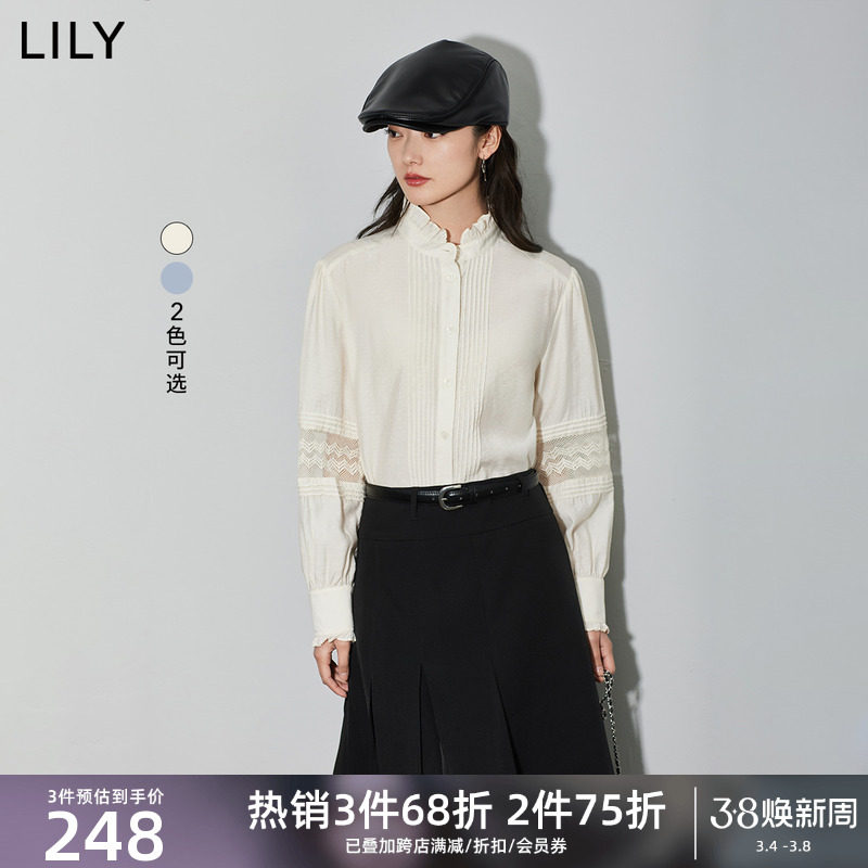 LILY2024春新款女装浪漫时尚拼接别致压褶优雅花边袖宽松垂感衬衫