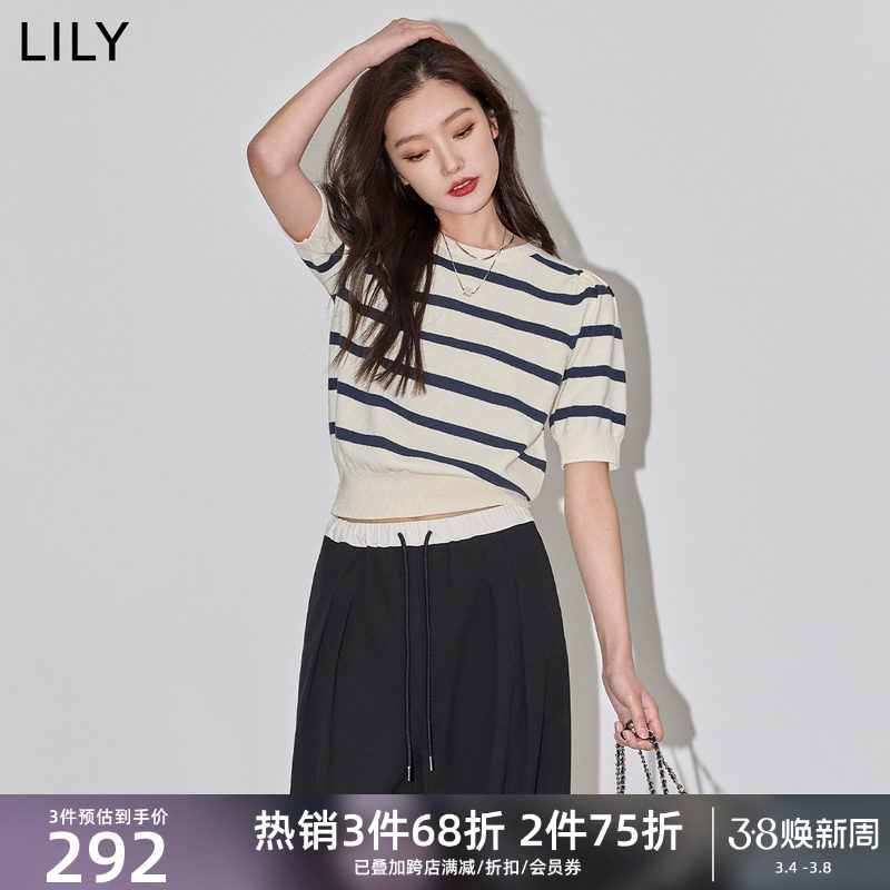 LILY2024春新款女装复古条纹时尚通勤气质泡泡袖修身短款毛针织衫