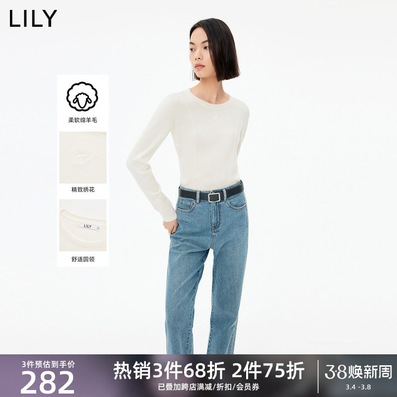 LILY女装柔软绵羊毛精致绣花百搭休闲修身款毛衫打底衫套头衫
