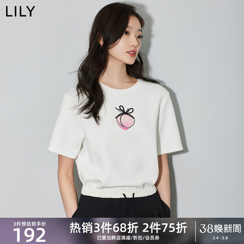 LILY2024春新款女装趣味俏皮印花百搭通勤款舒适圆领短袖T恤上衣
