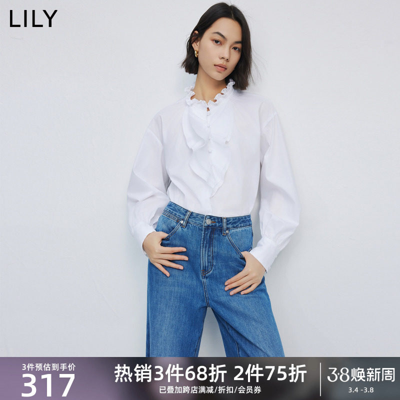 LILY2024春新款女装别致荷叶花边浪漫时尚都市通勤长袖垂感白衬衫