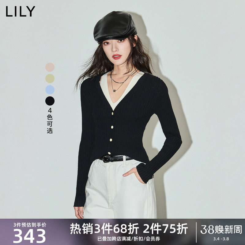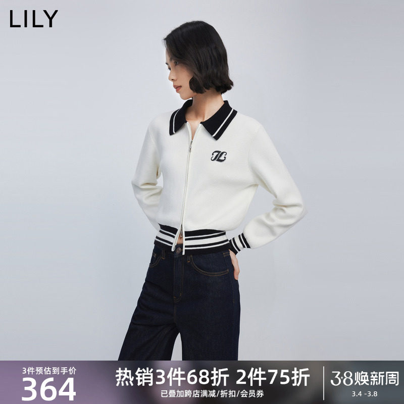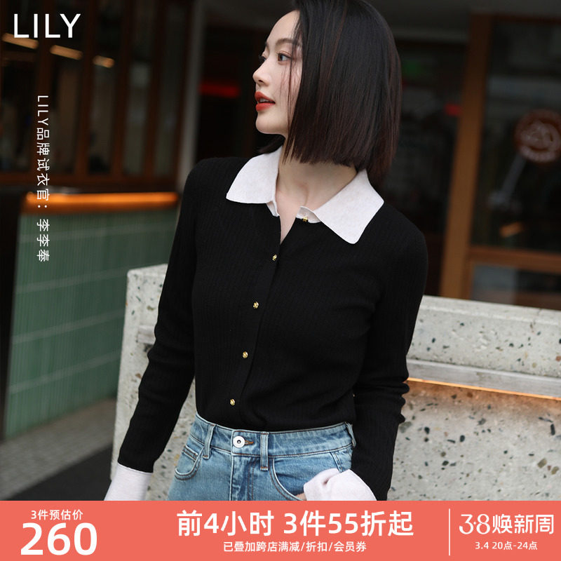 LILY新款女装别致撞色翻领修身针织开衫绝美小衫外搭舒适上衣女