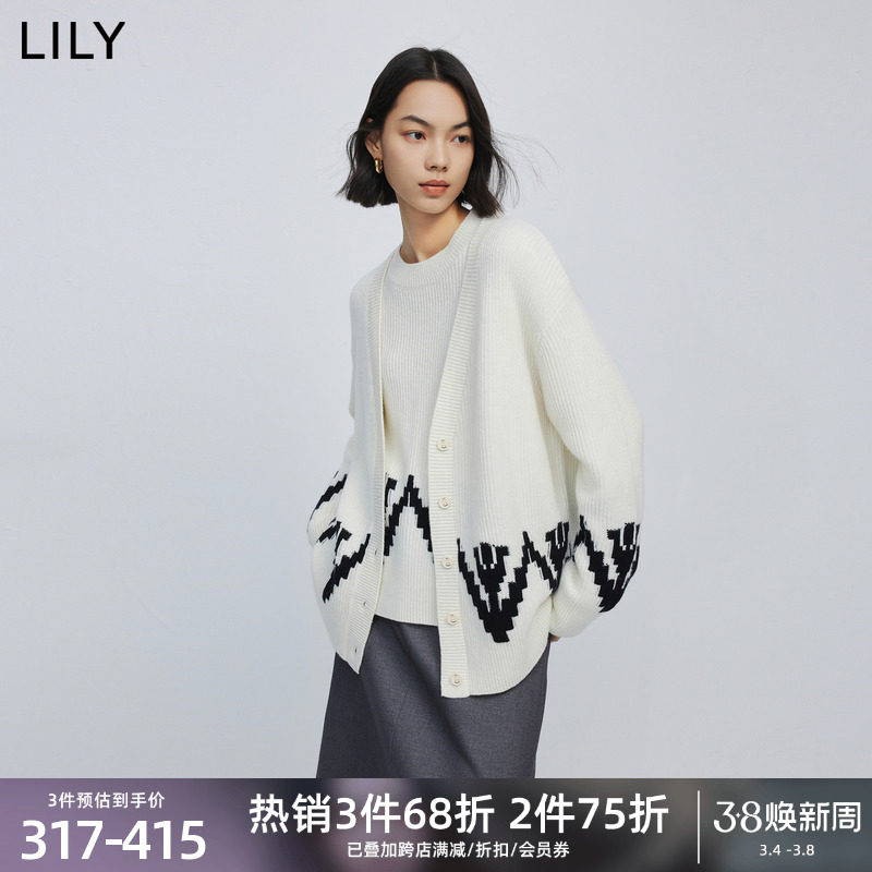 LILY2024春新款女装绵羊毛时尚复古提花气质通勤叠穿针织开衫外套