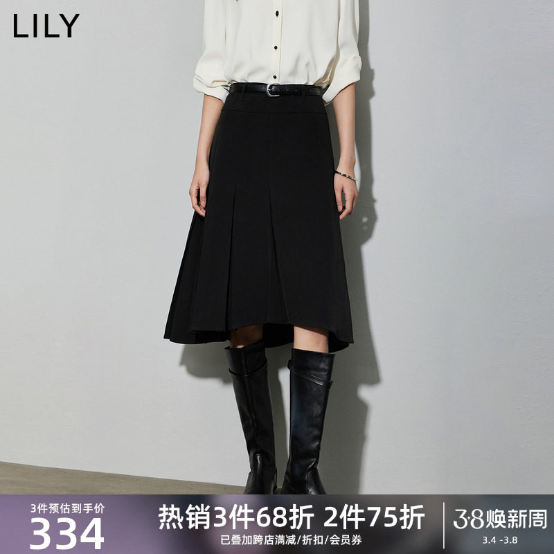 LILY2024春新款女装别致压褶气质通勤垂坠复古显瘦高腰A字半身裙