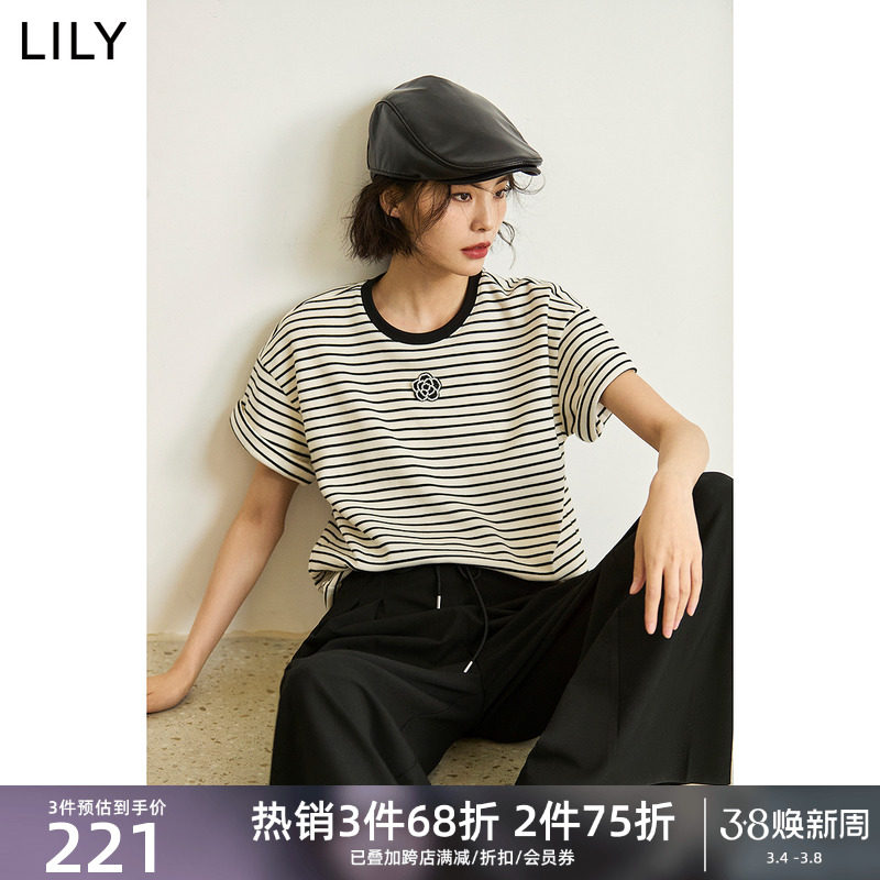 LILY2024夏新款女装时尚休闲通勤款百搭宽松舒适透气条纹短袖T恤