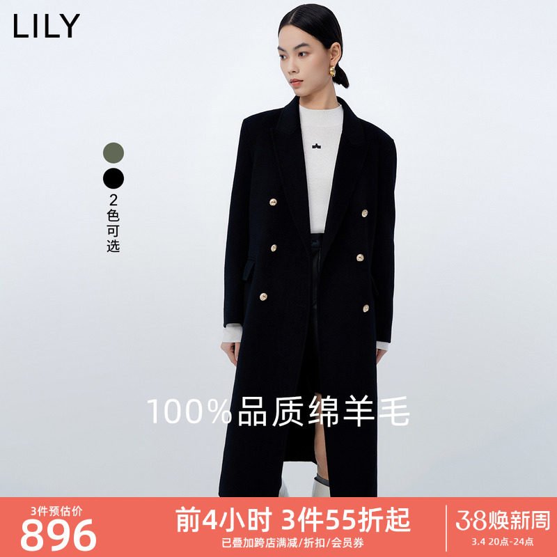 LILY新款女装全绵羊毛复古双排扣气质通勤长款毛呢外套大衣