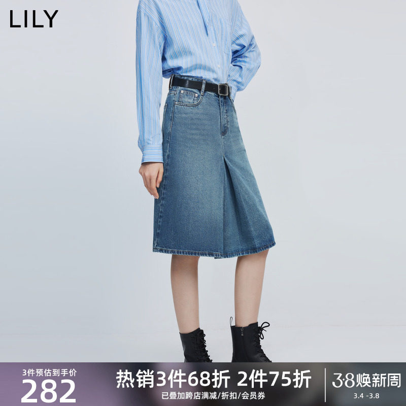 LILY2024春新款女装含天丝别致减龄学院风显瘦高腰A字牛仔半身裙