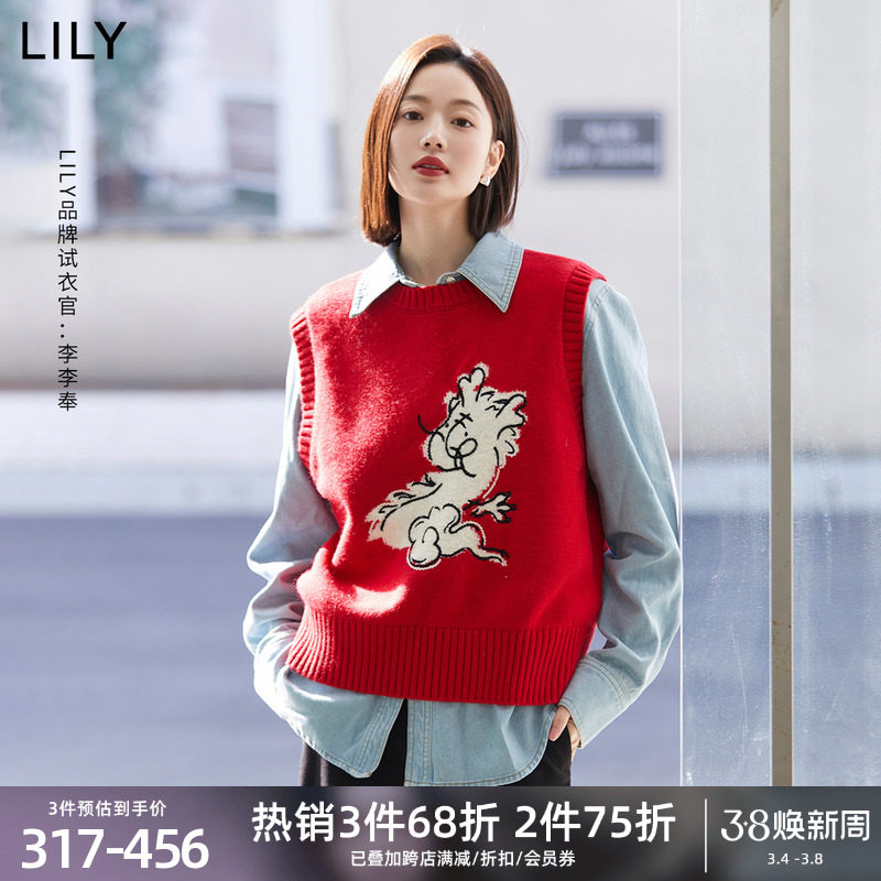 【喜乐灵龙】LILY2024春新款女装绵羊毛休闲复古红针织衫背心马甲