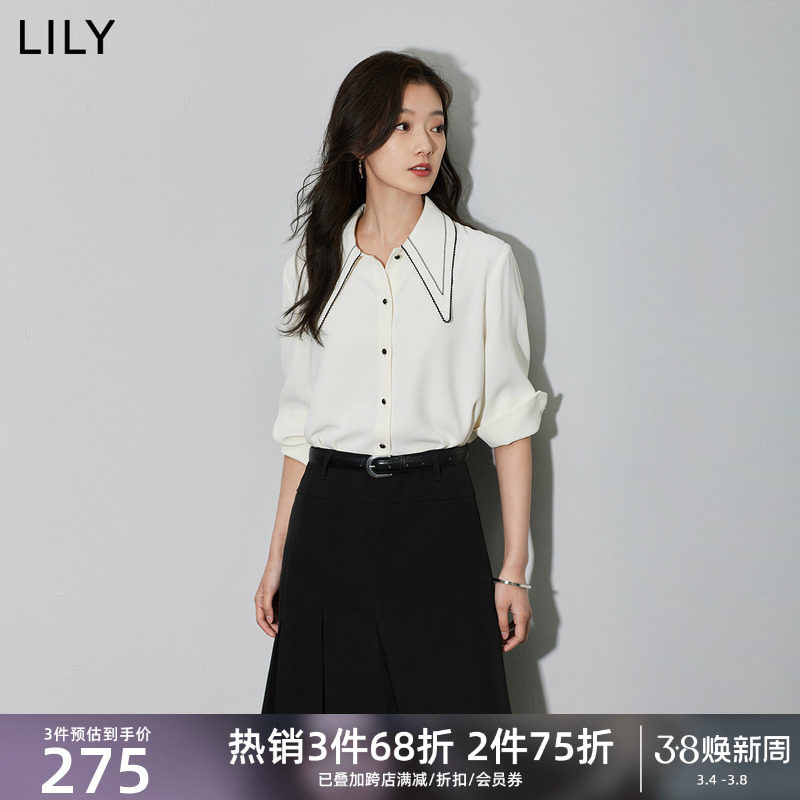 LILY2024春新款女装优雅气质通勤款垂坠感撞色镶边复古尖领白衬衫