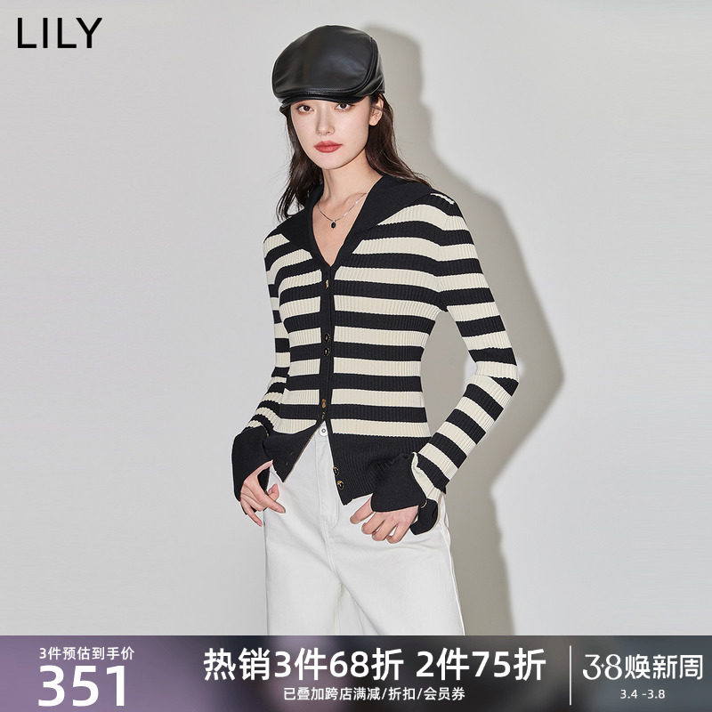 LILY2024春新款女装复古条纹时尚海军领修身针织开衫叠穿打底衫女