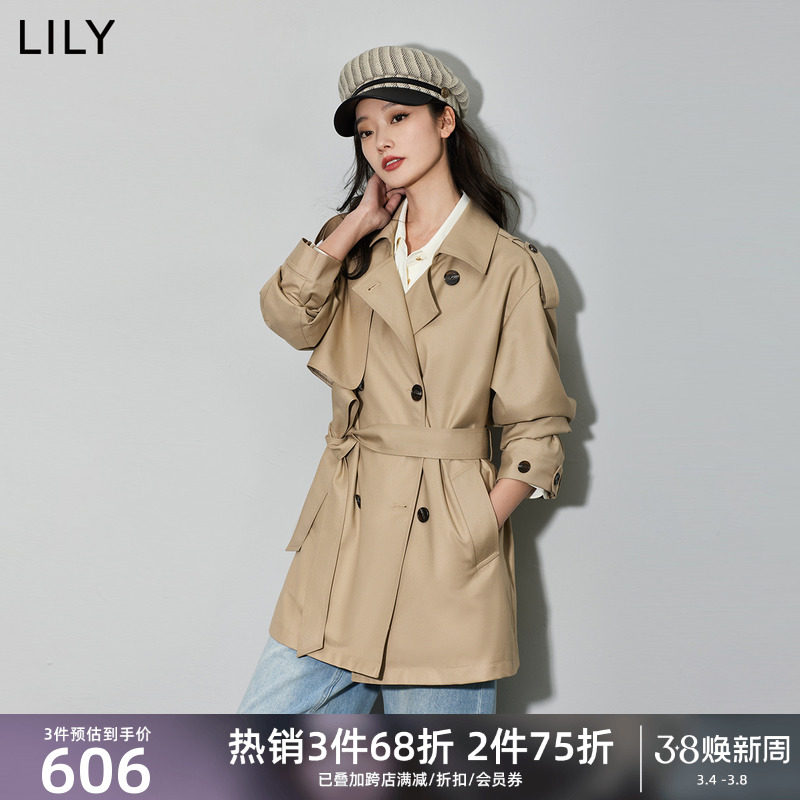 LILY2024春新款女装复古英伦风时尚腰带款双排扣中长款风衣外套女