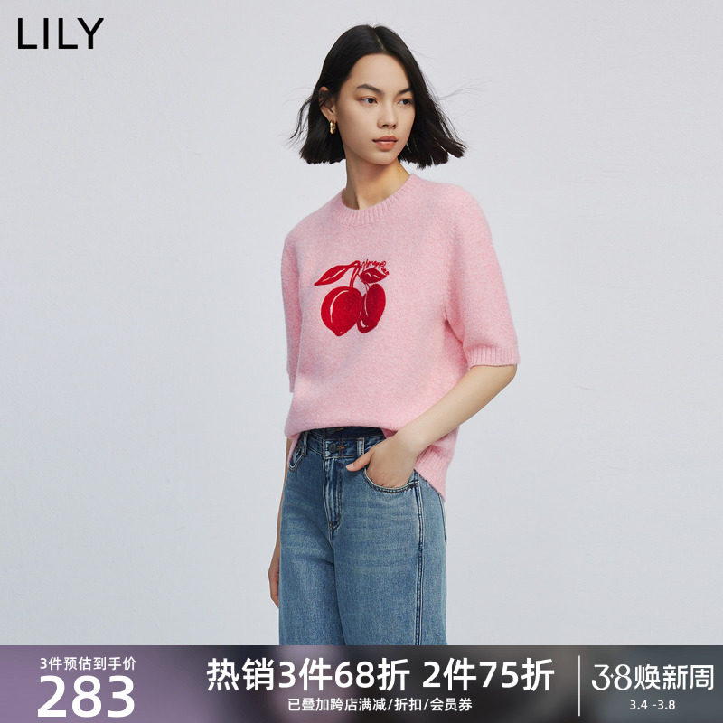 LILY2024春新款女装含绵羊毛趣味樱桃多巴胺穿搭时尚中袖毛针织衫