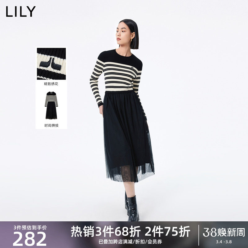 LILY新款女装气质复古条纹假两件优雅高腰通勤连衣裙简约小黑裙