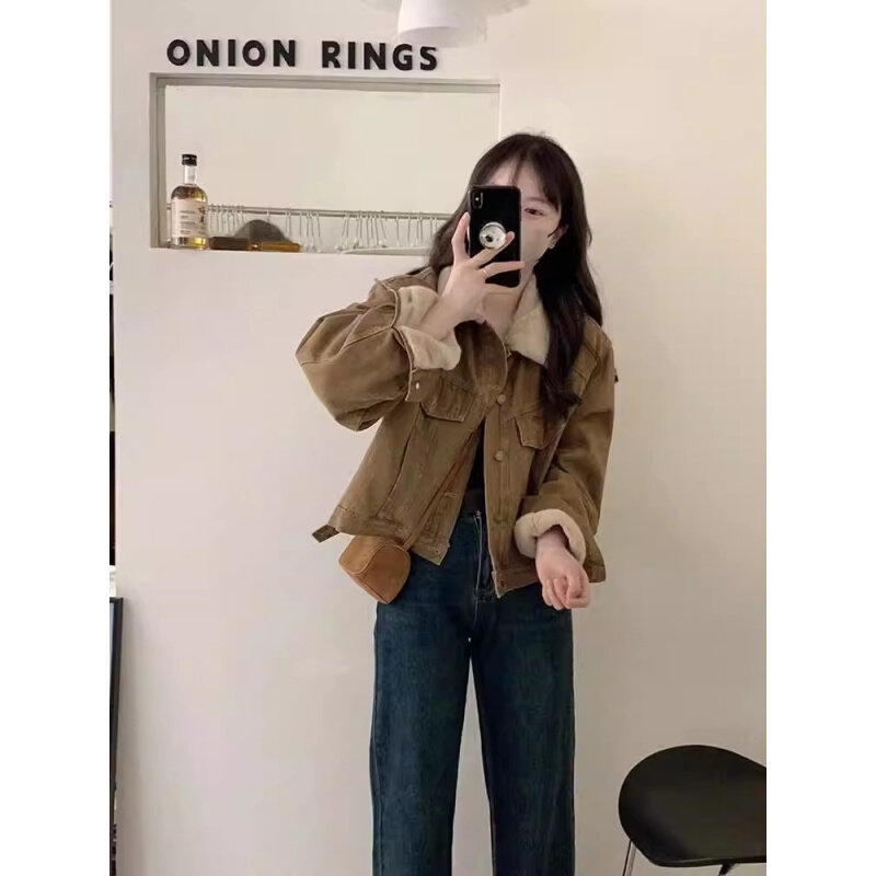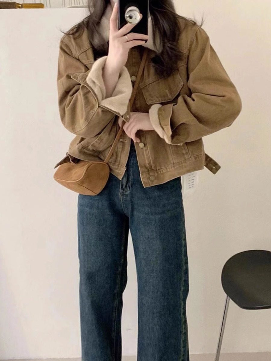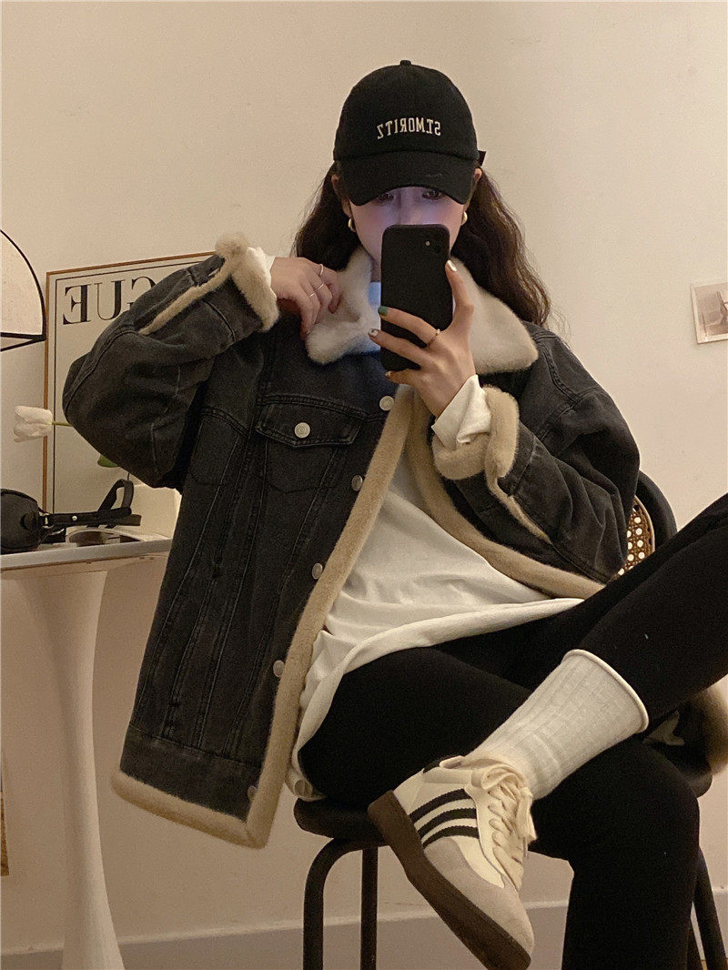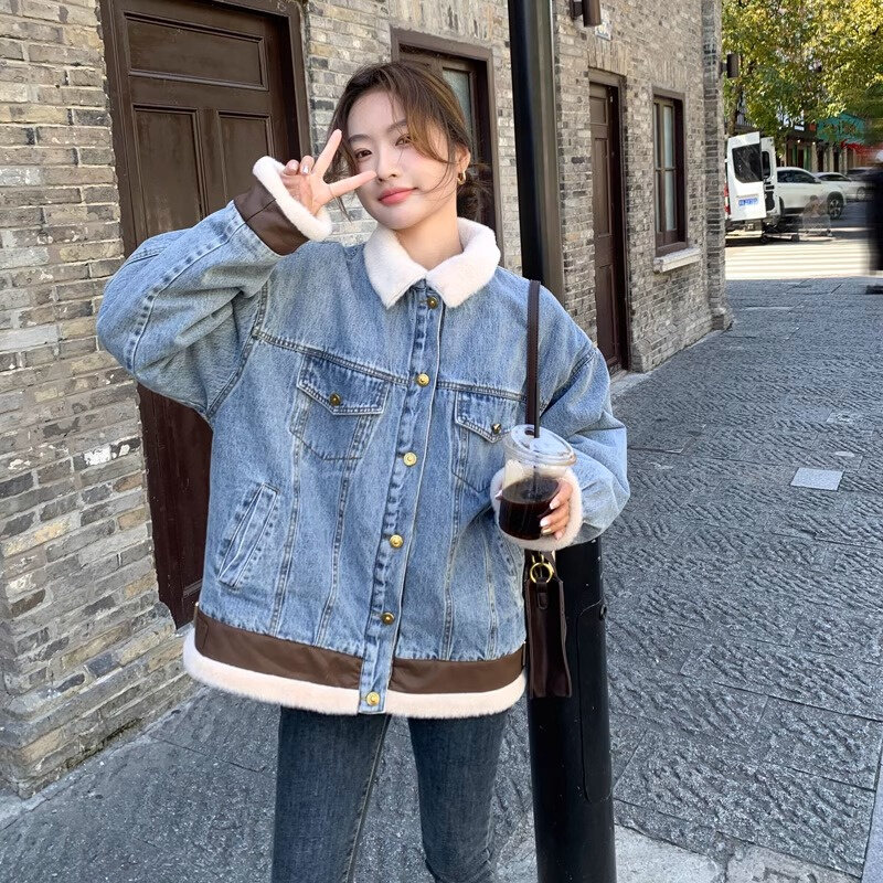 LILY MOST羊羔毛牛仔外套女秋冬季2023宽松加绒小个子加厚棉袄