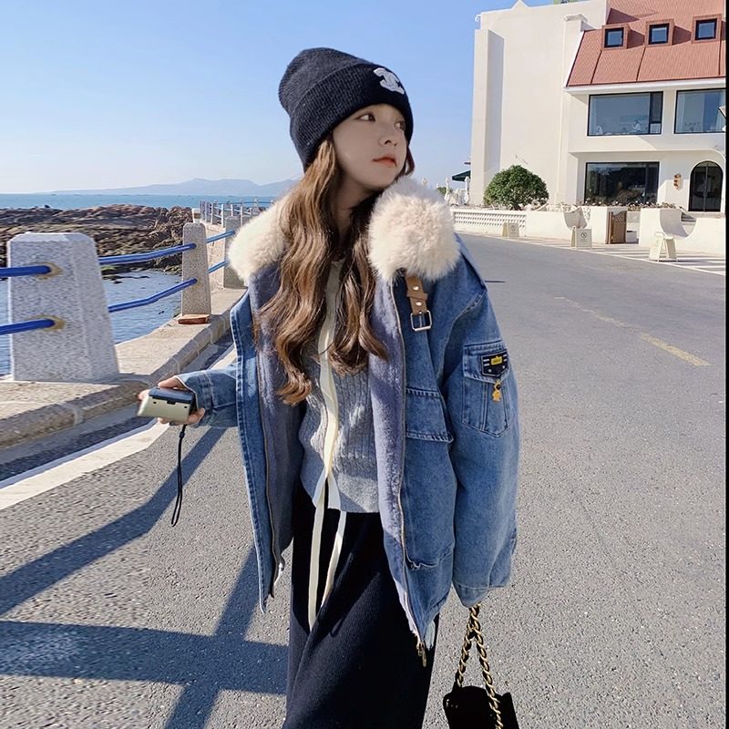 LILY MOST牛仔外套女加绒加厚2023冬季新款港风时尚宽松棉衣棉服
