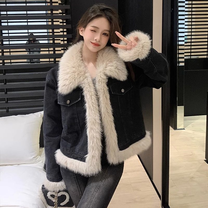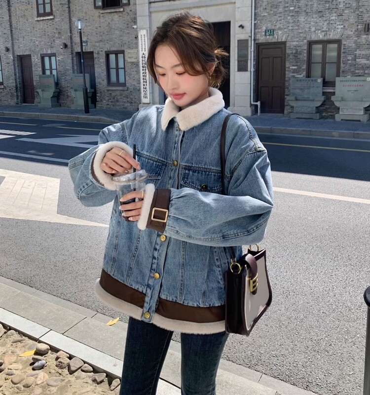 LILY MOST2023秋冬新款韩版流行加厚拼接设计感撞色毛领牛仔外套