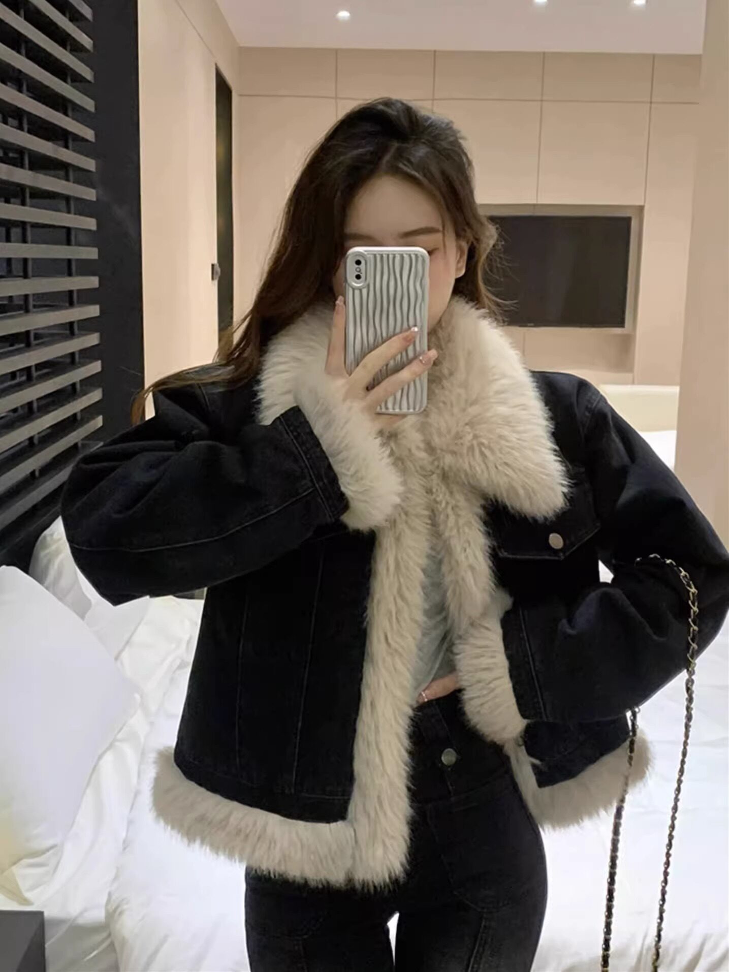 LILY MOST 2023秋冬新款炸街黑色牛仔短款拼接羊羔毛绒加厚外套女