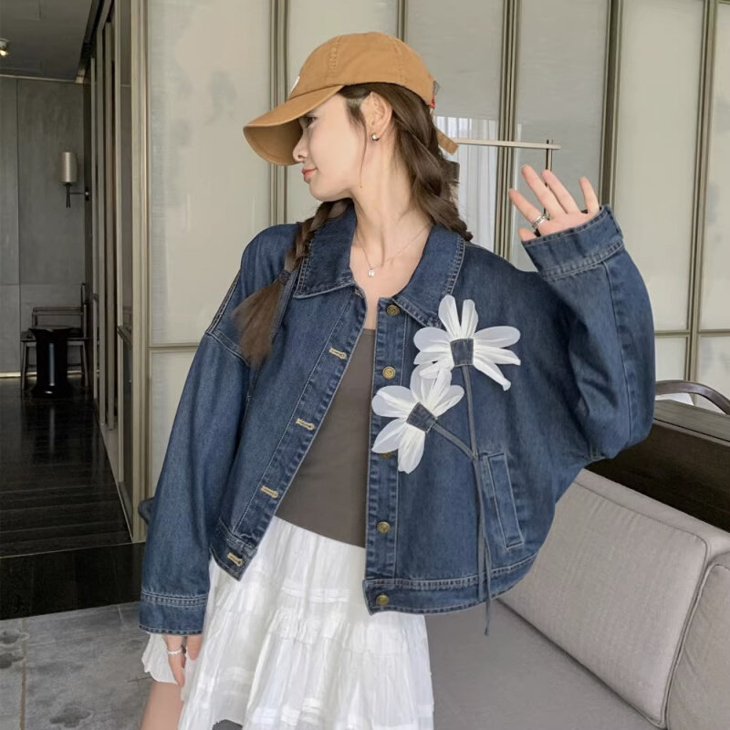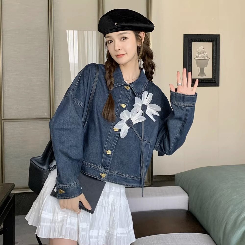 LILY MOST立体花朵拼接短款牛仔外套女2023秋季新款甜美减龄上衣