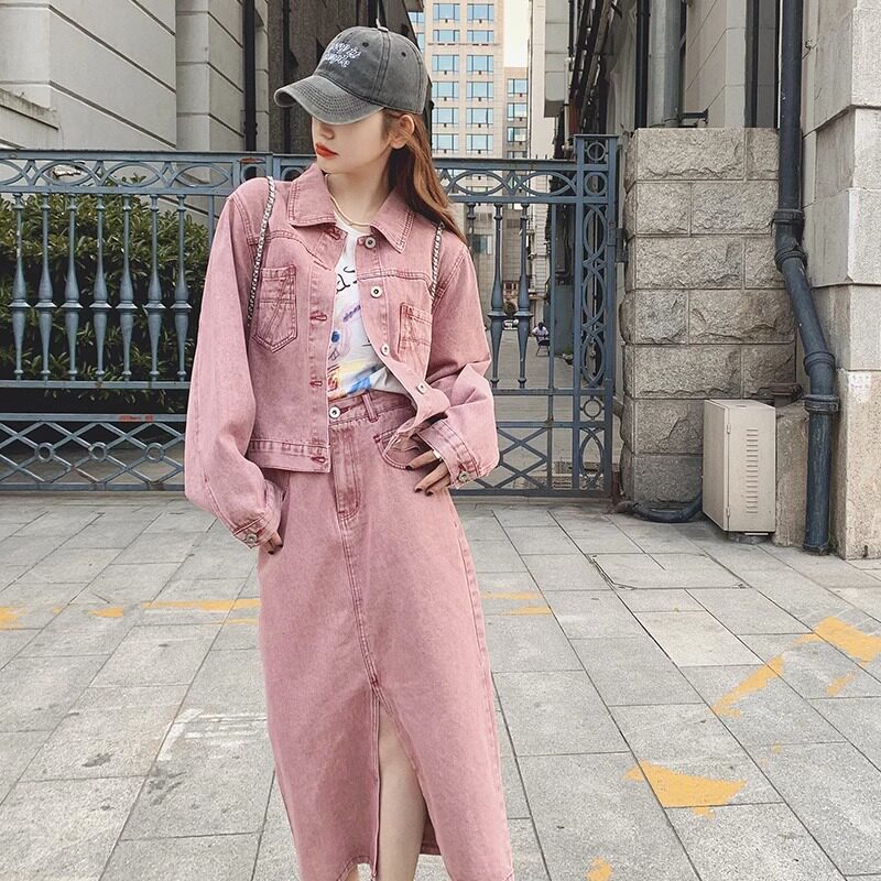 LILY MOST复古玫瑰粉色水洗牛仔短外套翻领女半裙套装两件套新款