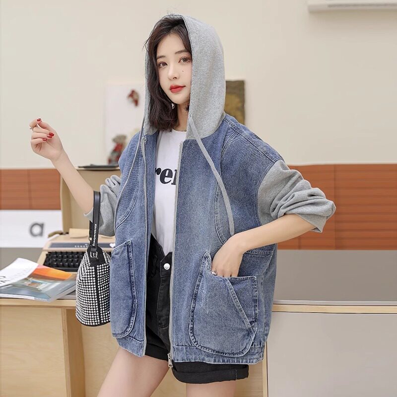 LILY MOST连帽牛仔外套拼接宽松大码短款拉链休闲夹克上衣棒球服