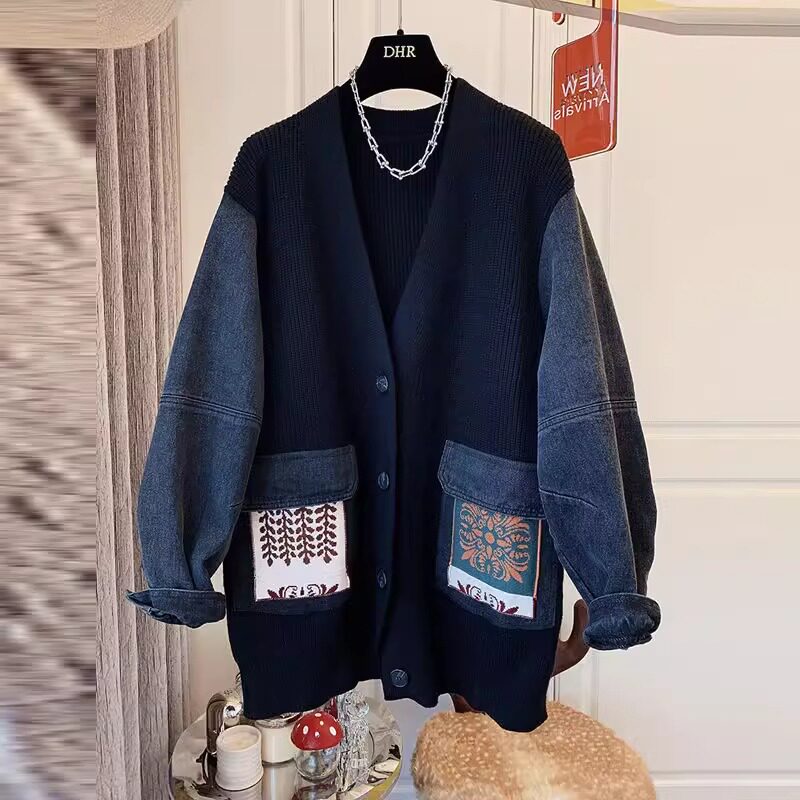 LILY MOST牛仔拼接针织开衫上衣秋冬季宽松个性复古毛衣外套女装