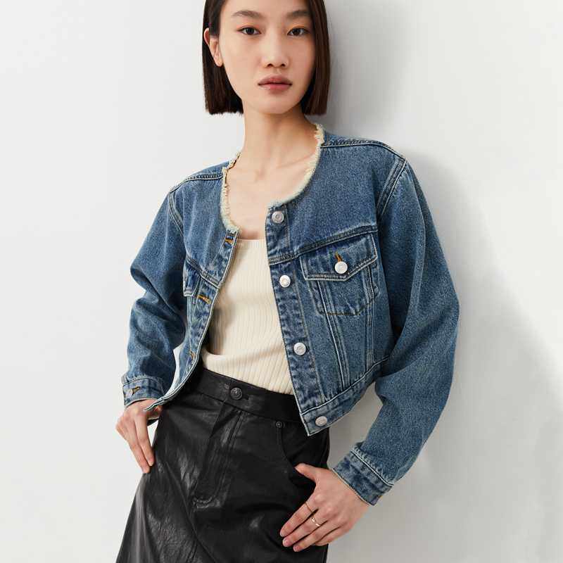 LILY2024春新款女装复古小香风全棉休闲通勤舒适圆领长袖牛仔外套