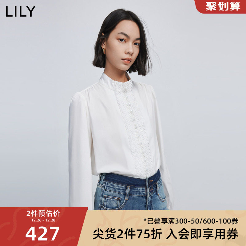 LILY2023冬新款女装浪漫花边优雅气质通勤时尚垂坠感立领白衬衫女