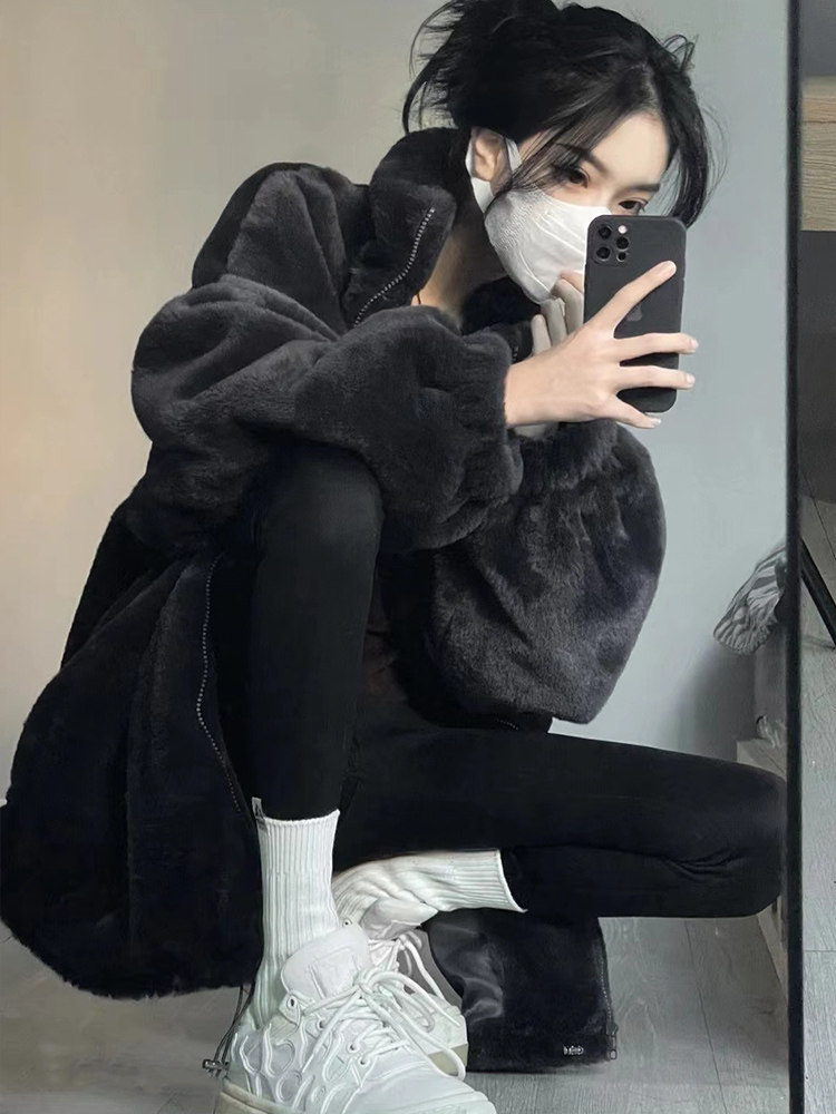 LILY MOST 黑色獭兔毛外套毛毛绒皮草外套短款宽松显瘦百搭