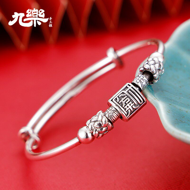 九乐足银999银手镯女平安喜乐中国风实心古法开口银镯子送女友礼